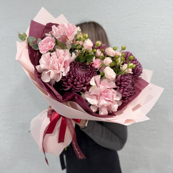 Авторский букет с бигуди-хризантемой, французскими розовыми розами, кустовыми розами и диантусами