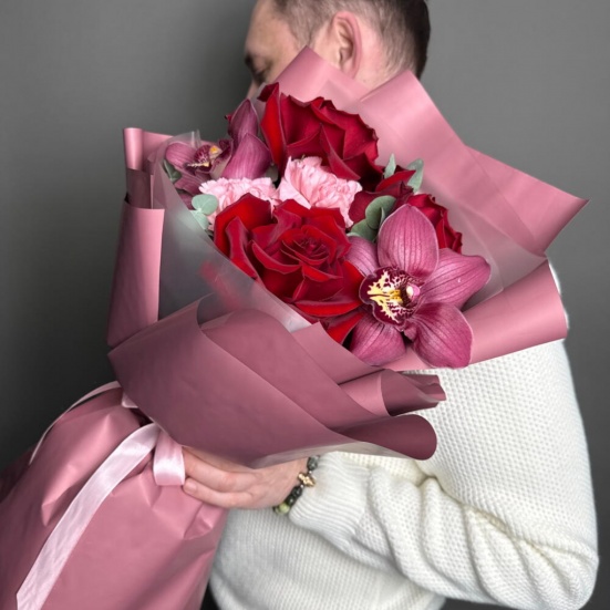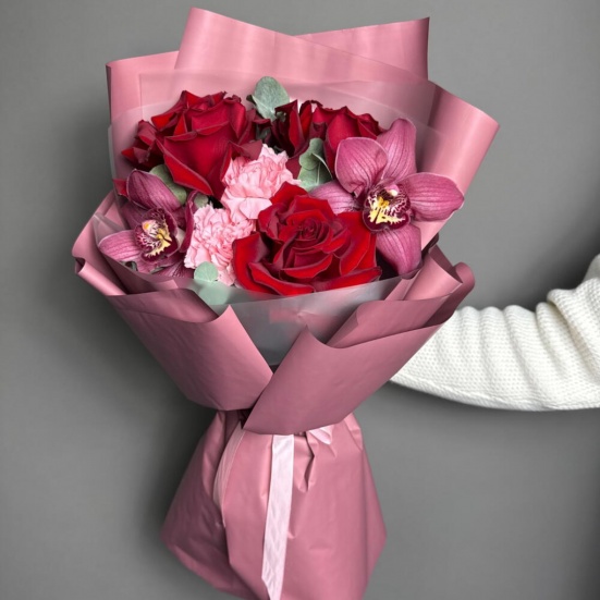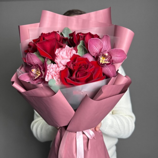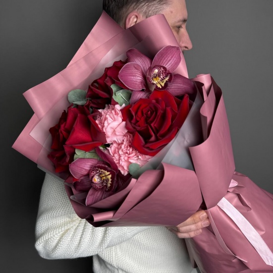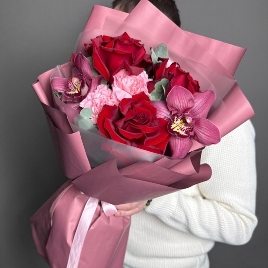 Букет из 3 красных роз, орхидей и диантуса в Нижнем Новгороде